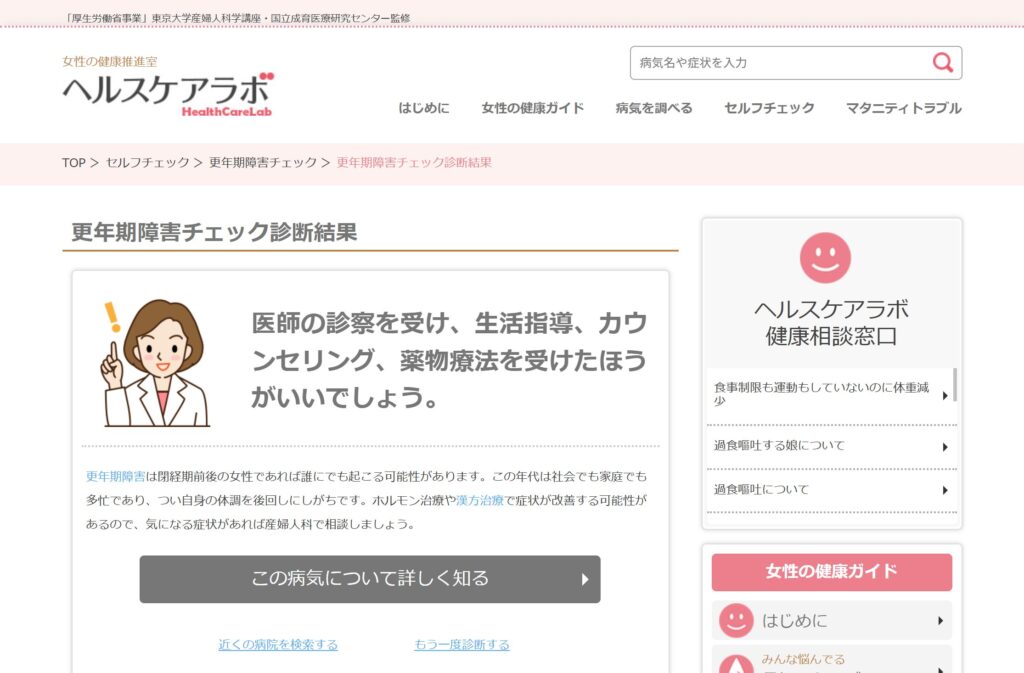 厚生労働省事業として提供されている「更年期障害チェック」を試してみました。監修は東京大学産婦人科学講座・国立成育医療研究センターです。